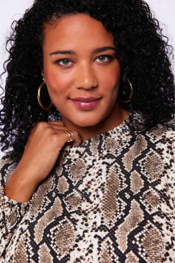 Deze blouse van Exxcellent valt op door de trendy snake print en het elegante opstaande kraagje. De soepele stof met een vleugje stretch maakt hem comfortabel om te dragen, terwijl de elastische boorden aan de mouwen zorgen voor een speelse finishing touch.