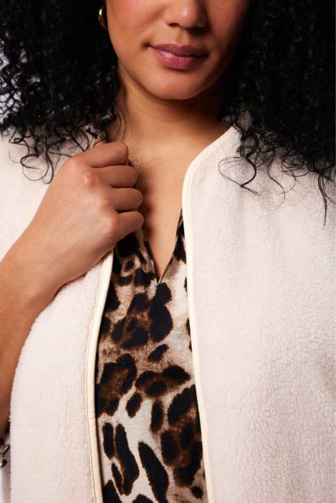 Dit zachte gilet van Exxcellent is perfect om je outfit een extra laagje en warmte te geven. Het model heeft een speelse, wollige structuur en is makkelijk te combineren over een blouse of trui. Een veelzijdig item dat je het hele seizoen door draagt.