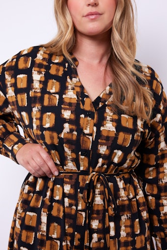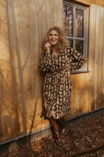 Geef je garderobe een stijlvolle upgrade met deze Exxcellent jurk van travelstof. De jurk heeft een speelse print in warme tinten en een doorknoopsluiting, waardoor hij zowel casual als chic gedragen kan worden. Het bijpassende ceintuur zorgt voor een mooie taille en geeft jouw look net dat beetje extra. Dankzij de travelstof is de jurk comfortabel, kreukvrij en ideaal voor een drukke dag vol afspraken of een avondje uit.