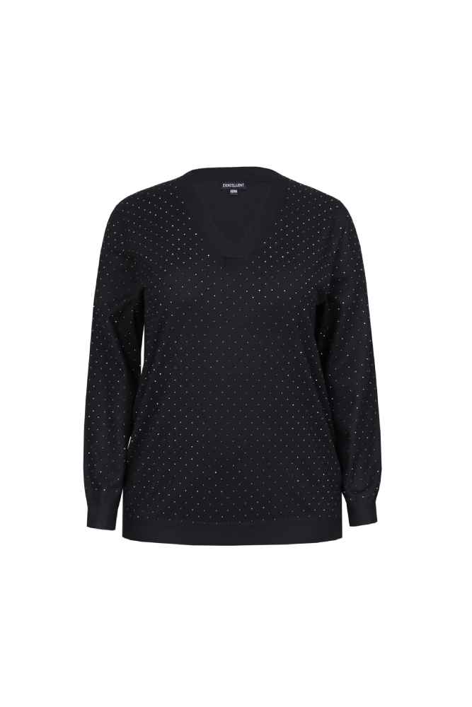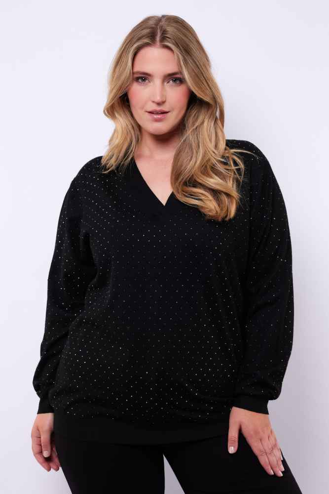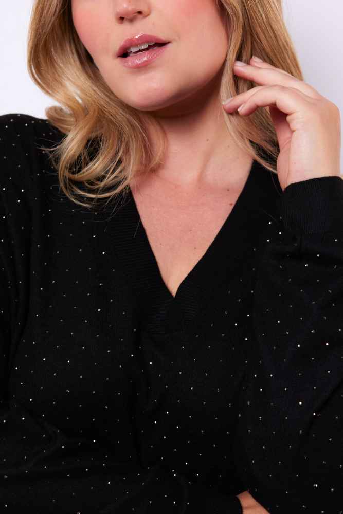 Deze zwarte trui van Exxcellent met subtiele glinstering is perfect voor een feestelijke touch! De comfortabele stof en de vrouwelijke V-hals maken hem ideaal voor dames met een maatje meer die van een beetje sparkle houden.