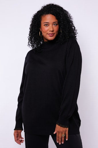 Deze zwarte trui van Exxcellent is een echte basisfavoriet — tijdloos, comfortabel en eindeloos te combineren. De zachte brei voelt heerlijk aan op de huid, terwijl de opstaande hals en ribboorden zorgen voor een verzorgde, moderne look. Draag hem casual met jeans of elegant met een rok of coated broek.