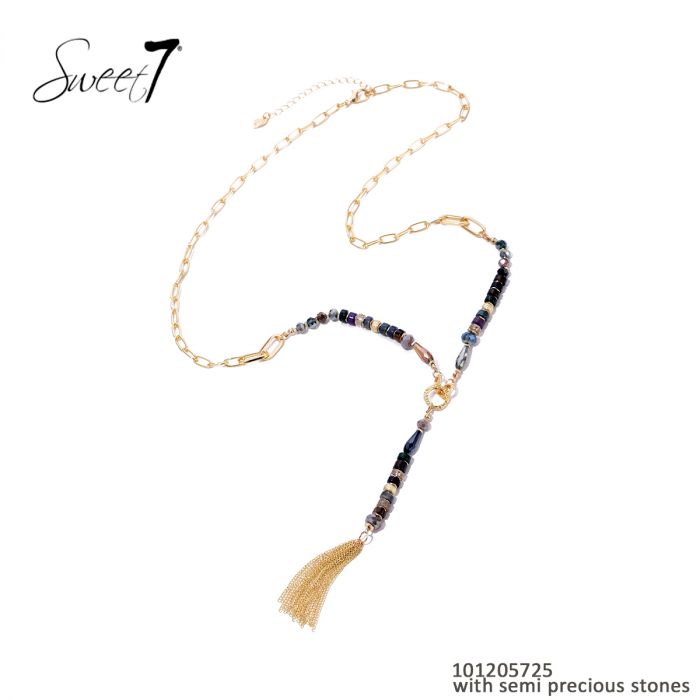 Deze lange ketting van Sweet7 is een speelse mix van kleuren en materialen. De combinatie van glaskralen, metaal en natuursteen geeft hem een unieke uitstraling, terwijl de goudkleurige kwast een trendy accent toevoegt. Perfect om je outfit mee te verlevendigen, of je nu casual of chic gekleed gaat.