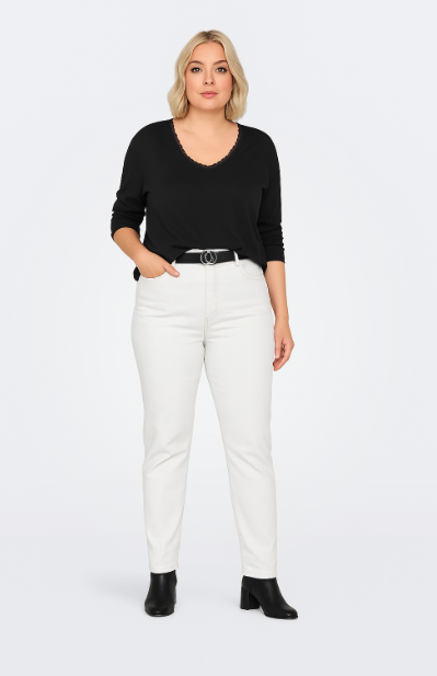 Deze zwarte jeans van ONLY Carmakoma is zo’n item dat je eindeloos kunt combineren. Het tijdloze model met rechte pijp zit comfortabel en is geschikt voor elke gelegenheid – of je nu casual gaat met sneakers of netter met een blouse en hakken.