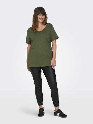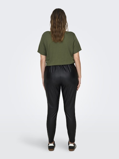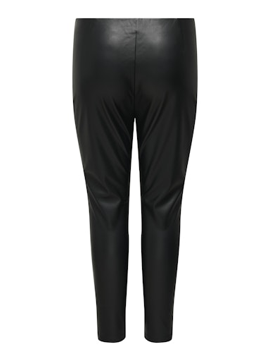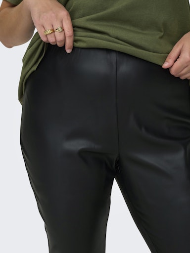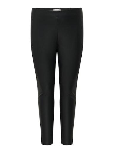 Deze zwarte legging met leatherlook van ONLY Carmakoma is een echte blikvanger. Combineer 'm stoer met een oversized trui of vrouwelijk met een blouse en hakken – alles kan! De comfortabele tailleband zorgt ervoor dat je 'm de hele dag met plezier draagt.