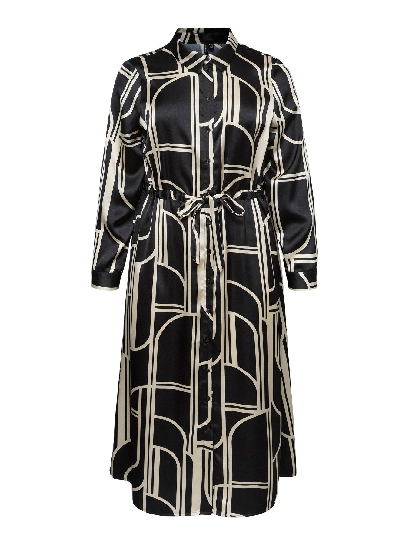 Deze Vero Moda Curve doorknoopjurk straalt klasse en moderniteit uit. Het glanzende materiaal en de grafische print geven de jurk een elegante look, terwijl het strikceintuur in de taille zorgt voor een mooi vrouwelijk silhouet.