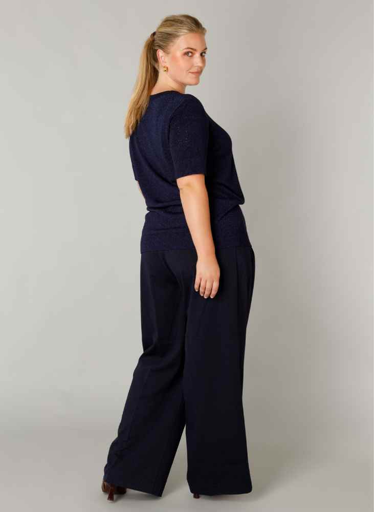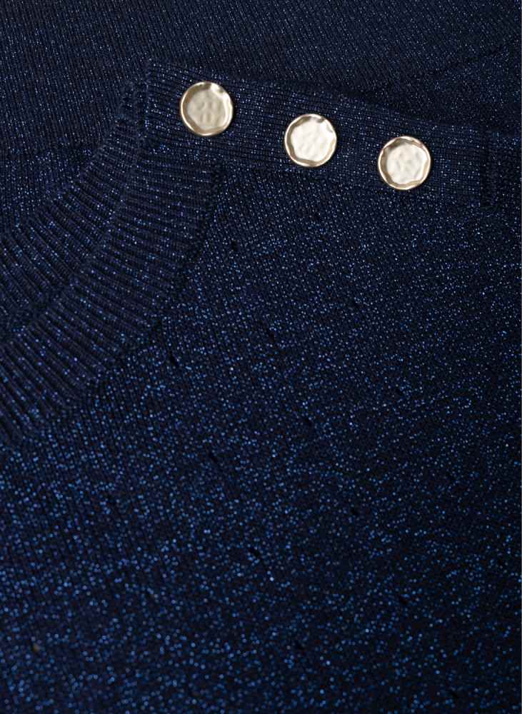 Deze donkerblauwe top van Yest Curve straalt subtiele elegantie uit. De fijne glitter in de stof en de decoratieve knoopjes op de schouder geven een feestelijke touch, terwijl de gebreide kwaliteit en aangesloten boord zorgen voor een mooie pasvorm. Ideaal voor een diner of feest, maar ook perfect voor een casual-chique look.
