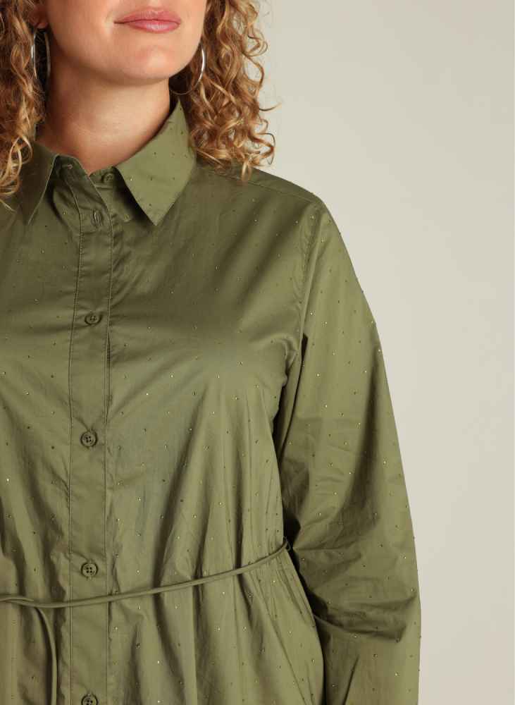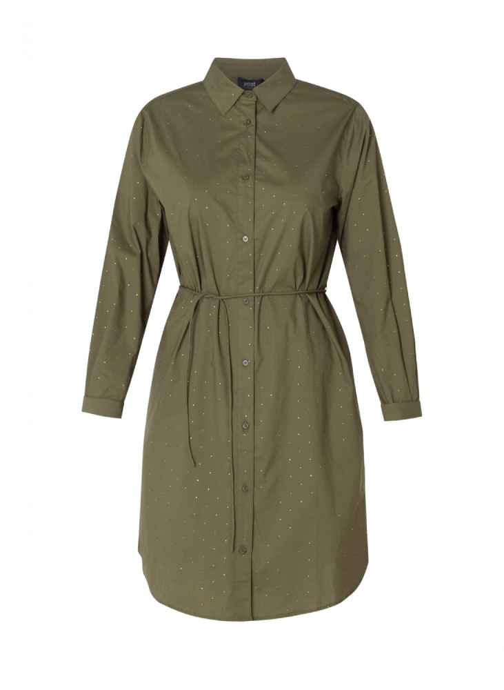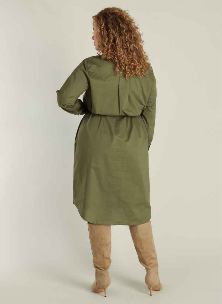 Deze olijfgroene jurk van Yest Curve is een stoere en stijlvolle keuze. De doorknoopsluiting en het strikceintuur geven de jurk een mooi silhouet, terwijl de subtiele strassteentjes zorgen voor een verrassend sprankelend detail. Gemaakt van 100% katoen, dus heerlijk comfortabel om te dragen.