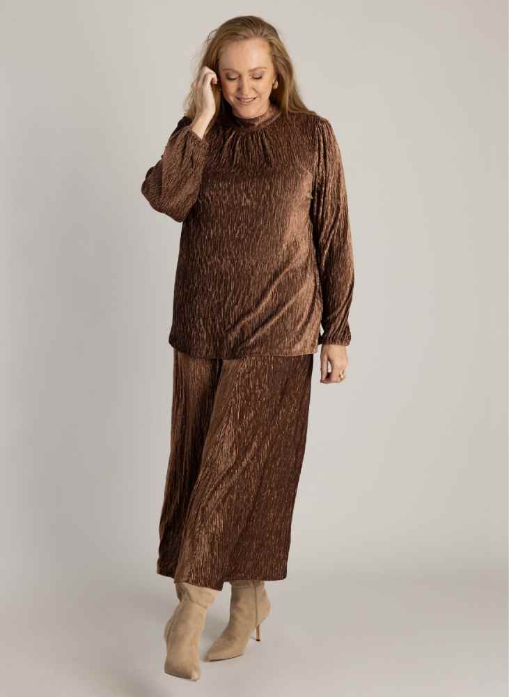 Deze koperkleurige blouse van Yest Curve heeft een chique glans en een subtiele plisséstructuur. De hoge hals en licht gepofte mouwen geven het model een elegante uitstraling, perfect voor feestelijke gelegenheden of een stijlvolle avondlook. Combineer met de bijpassende rok voor een compleet setje.