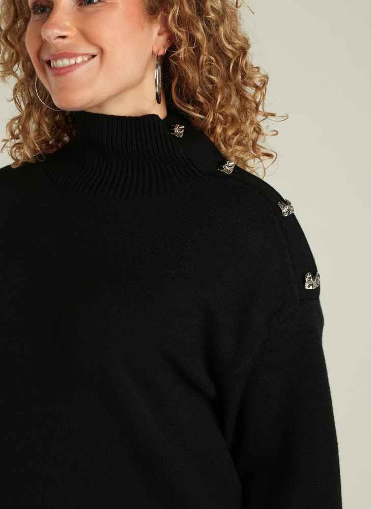 Deze zwarte trui van Yest Curve is een stijlvolle basic met een verrassende twist. De col houdt je lekker warm, terwijl de decoratieve knopen op de schouder zorgen voor een speels en vrouwelijk detail. Perfect te combineren met zowel een broek als een rok.