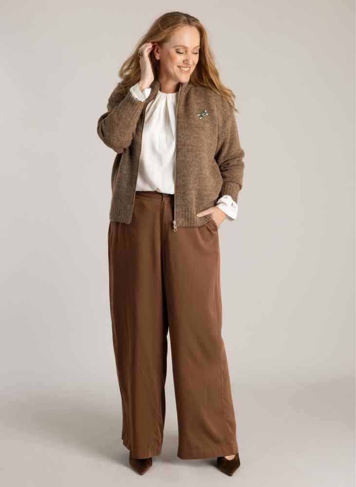 Dit bruine vest van Yest Curve heeft een sportieve én stijlvolle uitstraling. De zachte gebreide stof voelt heerlijk warm aan, terwijl de goudkleurige rits het geheel een chique touch geeft. Draag het vest open over een blouse of dicht als comfortabel tussenlaagje.