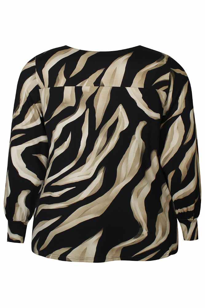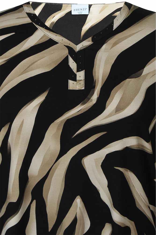Op zoek naar een statement top met een comfortabele fit? De Saia top van Zhenzi combineert een opvallende zebra-achtige print met een zachte stretchstof. De subtiele V-hals met sierknoopjes geeft een vrouwelijke touch, terwijl de soepele stof heerlijk draagt – ideaal voor elke dag.