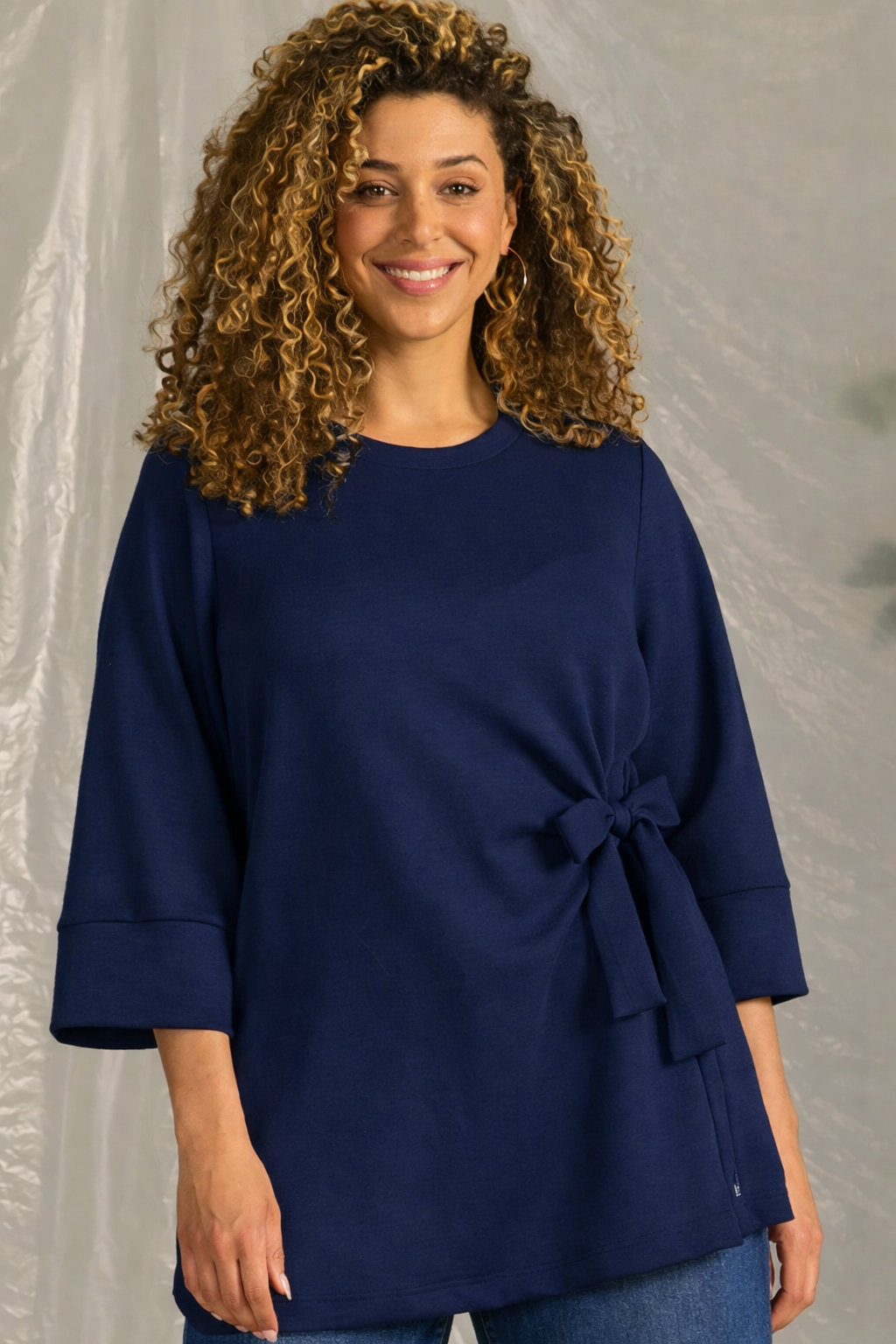 Deze donkerblauwe trui is zo’n item dat je meteen goed laat voelen. De rechte, comfortabele fit krijgt net wat extra’s door het strikdetail aan de zijkant, waardoor je taille mooi uitkomt zonder dat het strak zit. De 3/4 mouwen maken ’m perfect voor elk seizoen: niet te bloot, niet te warm.